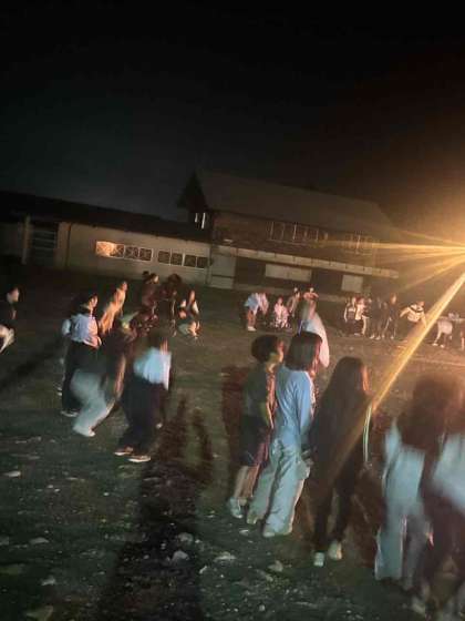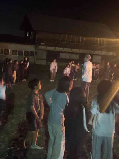 キャンプファイヤーが始まりました!火を囲んでみんなで大盛り上がりです。