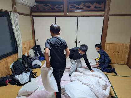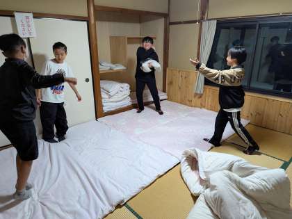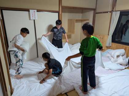 布団をみんなで協力して用意しています。シーツ、枕カバーの使い方を説明しました。