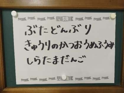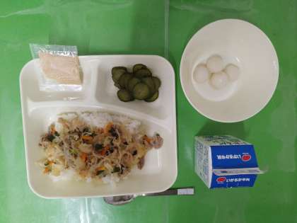 今日の給食は、豚丼、きゅうりのかつお梅風味、白玉だんご、牛乳です。