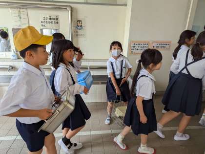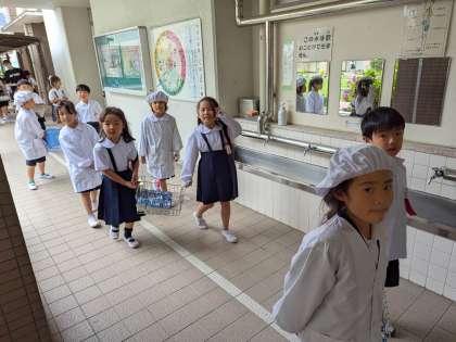 ご飯を食べ終え、給食の食器や食缶を片付けます。しっかり持って落とさないようにしましょう。