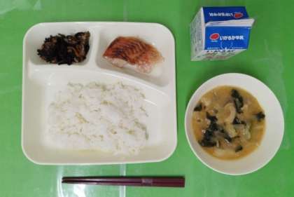 今日の給食は、ごはん、牛乳、赤魚のしょうゆだれかけ、みそ汁、ひじきのいため煮です。