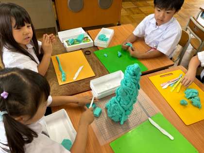 粘土でタワーを作りました。『東京タワーを作ろう』『細長くすると高さが出るで』などと話し合いながら班で一つの作品を作っていました。