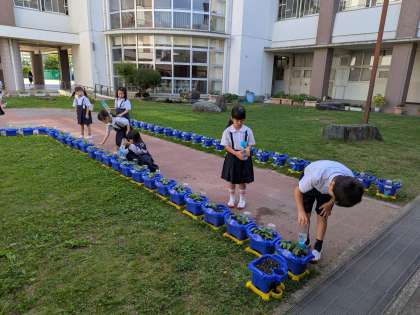 朝の登校が終わると水やりを頑張っています。「大きくなぁれ。」やさしく水やりしましょうね。