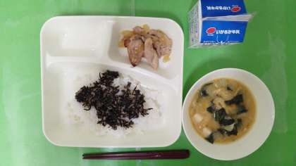 今日の給食は、ごはん、牛乳、鶏肉の甘辛焼き、みそ汁、魚ひじきそぼろです。