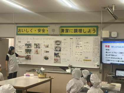 今日は2組の調理実習です。ほうれん草のおひたしとゆで卵です。先生の説明をよく聞いてから準備開始!ほうれん草を丁寧に洗ったりゆで卵の殻を剥いたりしてみんなで美味しくいただきました。