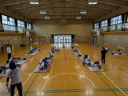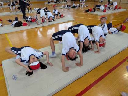 マット運動遊びで、ブリッジに挑戦しています。お腹と背中に力を入れて、手と足で体を支えて反り上げます。できた技で列が完成したら、ビンゴです。レッツ、マット運動ビンゴ!