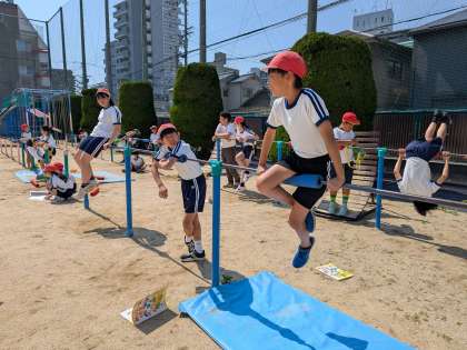 鉄棒運動の洗練された技の発表です。支持、逆さ、回転の感覚をつかみます。