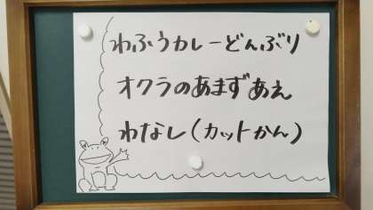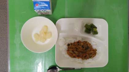 今日の給食は、和風カレー丼、オクラの甘酢あえ、和なし(カット缶)、牛乳です。
