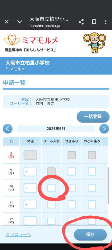 ミマモルメの連絡ノート(申請)から、プール入水にチェックしていたたき、保存ボタンをクリックして完了です。