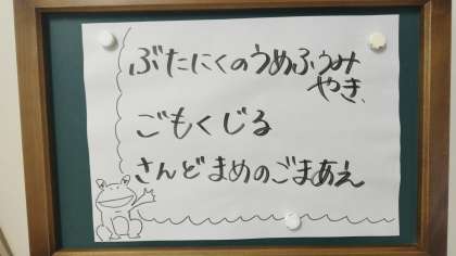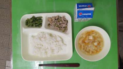 今日の給食は、ごはん、牛乳、豚肉の梅風味焼き、五目汁、さんどまめのごまあえです。