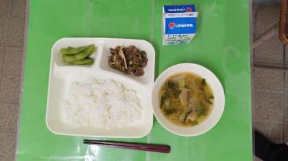 今日の給食は、ごはん、牛乳、チンジャオニューロウスー、中家みそスープ、枝豆です。