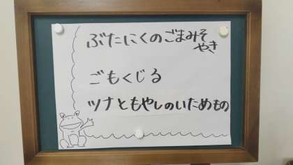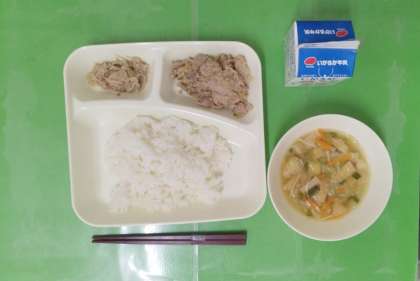 今日の給食は、ごはん、牛乳、豚肉のごまみそ焼き、五目汁、ツナともやしのいためものです。