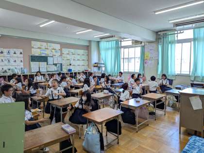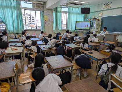 英語で体を動かしながらアルファベットを覚える練習をしています。