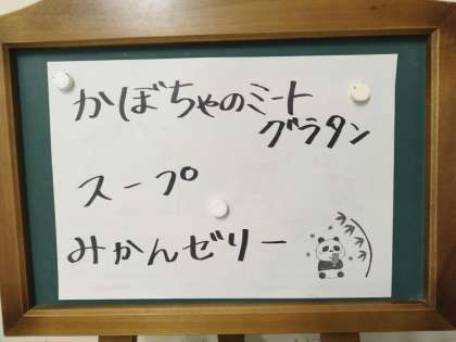 今日の給食は、黒糖パン、牛乳、かぼちゃのミートグラタン、スープ、みかんゼリーです。