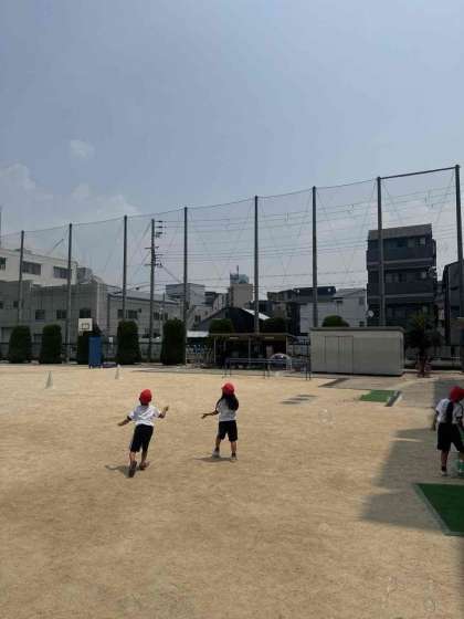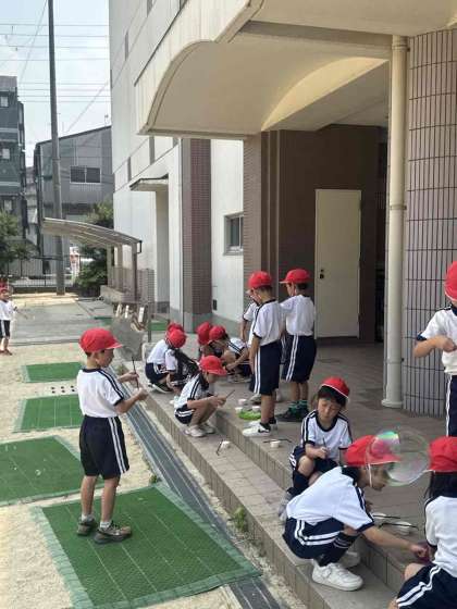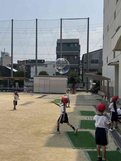1年生が、生活科の学習でシャボン玉を作って楽しんでいます。子どもたちが自然と遊びを通じて学ぶことはとても大切です。シャボン玉を飛ばすことで、観察力や手の器用さを鍛えます。また、友達とのコミュニケーションを深める機会となっています。空に上がっていくシャボン玉に太陽光があたってキラキラ輝く様子を見て子どもたちの笑顔もはじけています。