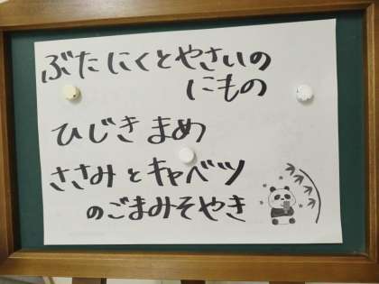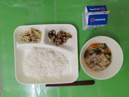 今日の給食は、ごはん、牛乳、豚肉と野菜の煮もの、ひじき豆、ささみとキャベツのごまみそ焼きです。