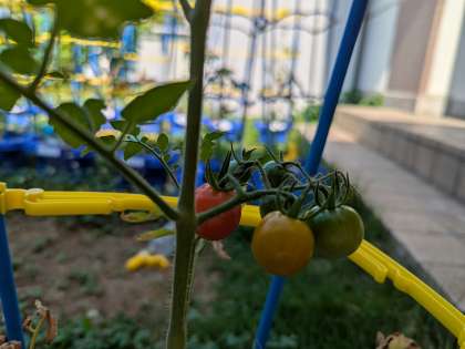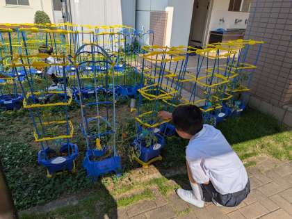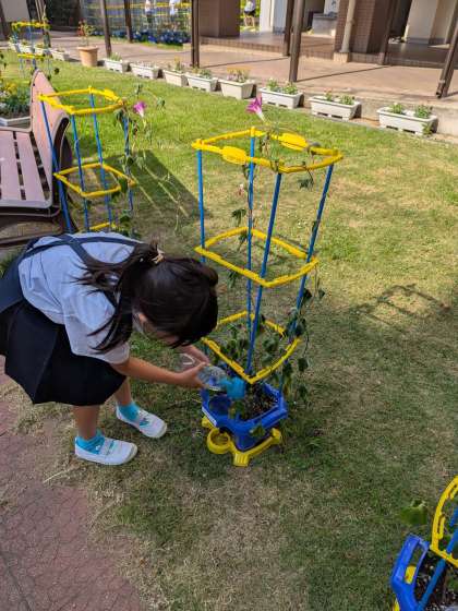 心を込めて水やりをしています。アサガオ、ミニトマトが育ってきました。