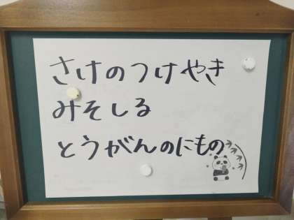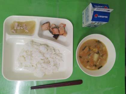 今日の給食は、ごはん、牛乳、鮭のつけやき、みそ汁、冬瓜の煮ものです。