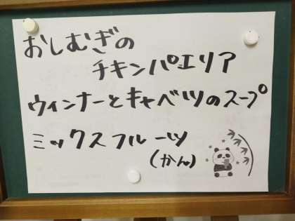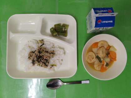 今日の給食は、ごはん、牛乳、鶏肉と一口がんもの煮もの、オクラの梅風味、ツナっ葉いためです。