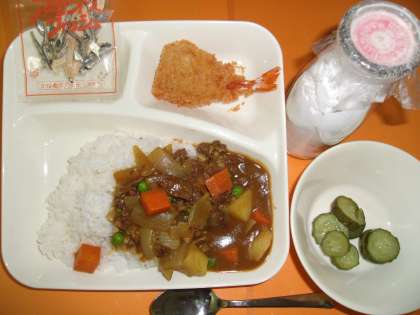えびフライカレーライス きゅうりのピクルス アーモンドフィッシュ