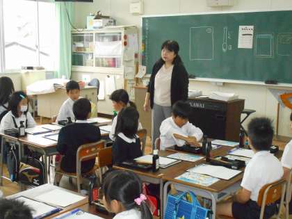 教頭先生の指導のもと、初めての習字をしました。筆のおろし方、墨のつけ方など、習字の基本を習いました。神妙な顔つきで、筆を立ててゆっくりと書きました。上手な字を書ける気持ちになりましたね。