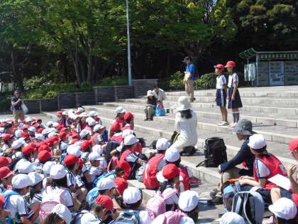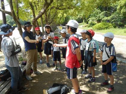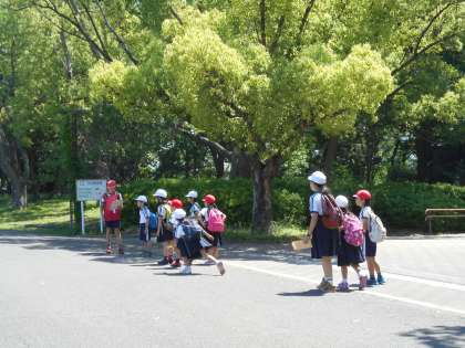 24班のたてわり班でチェックポイントを回りました。チェックポイントでは、先生とジャンケンをしたり、遊具ではバランスゲームなどをして楽しみました。6年生がリーダーシップを発揮して活躍していました。