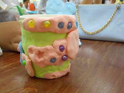 紙粘土に絵具を刷り込み、自分の好きな色のついた紙粘土を作り、ボトルやプリンのケース、箱などに張り付けて、小物入れを作りました。ビーズやビー玉などをつけて、ハッピーな気分になるすてきな小物入れが完成しました。