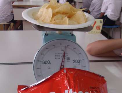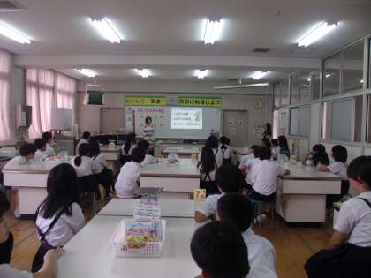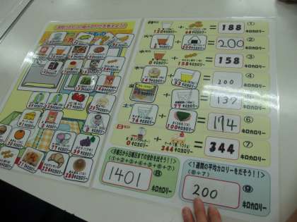 お菓子の会社、カルビーの方に来ていただき、おやつの食べる量、食べる時間、食品の裏面表示について勉強しました。そのあと、班でたくさんあるおやつの絵図から、カロリー表示を見ながら適量を選んでいくゲームをしました。おやつは楽しみの食べ物と同時に補食の食べ物でもあるが、成長に必要な3度の食事の邪魔にならない量であることを学びました。