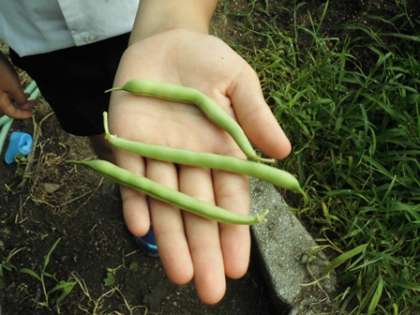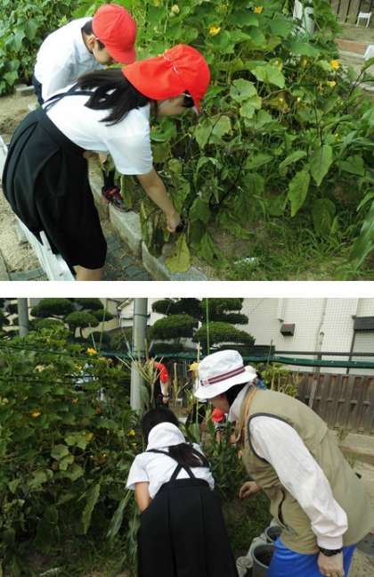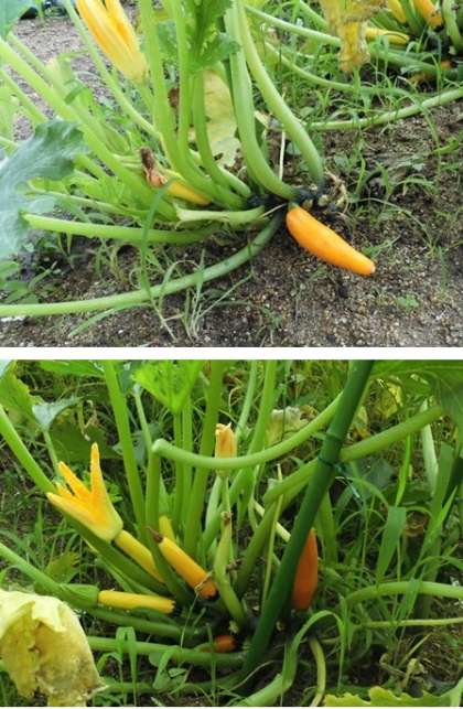 5年生の学習園です。「なすび」や「インゲン」「とうもろこし」などがたくさん実っています。黄色い野菜は「ズッキーニ」です。こんな風に実をつけるんですね。