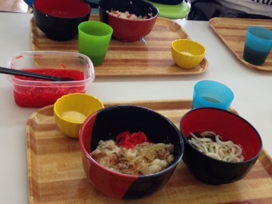 昼食の献立は、牛丼と冷やしうどんです。