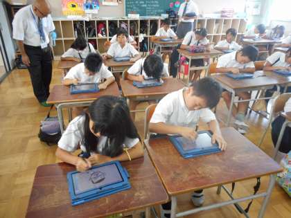 本日、ICT支援員さんが本校に来ました。実際に授業に入ってもらい、タブレット端末を操作する担任の補助や子どもたちの使用の支援をしていただきました。大変助かりました。また、職員室では個別に色々と質問したことに対して、丁寧に教えていただきました。放課後にはスカイメニュープラスの使い方について研修しました。教職員が少し自信を持ってタブレット端末が使えるようになったと思います。