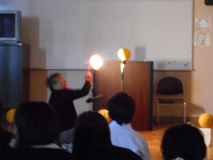 多目的室に月の満ち欠けを調べる実験装置を作り、学習しました。子どもたちは真ん中に座り、ボールにライトを当てて、月が明るく見える部分と暗く見える部分を確かめました。月が、三日月⇒上弦の月⇒満月⇒下弦の月⇒新月へと変わっていく様子を見ました。教科書の写真だけではよくわからなかったことが、実際にライトを当ててみると変化の様子がよくわかりました。