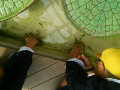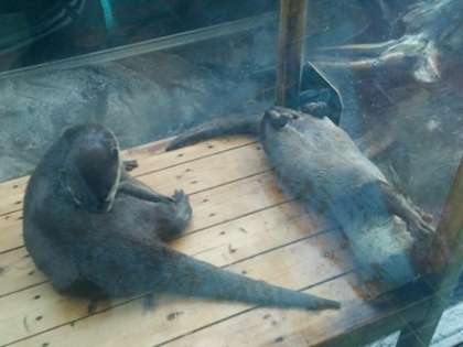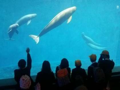 イルカのいる大きな水槽の前で撮った写真は、なんだか夢の世界の中に入ったようですね。