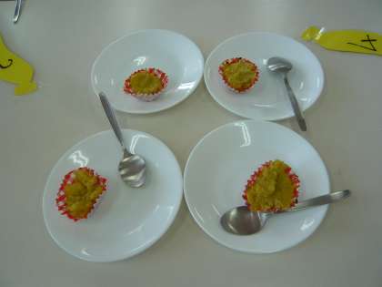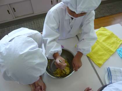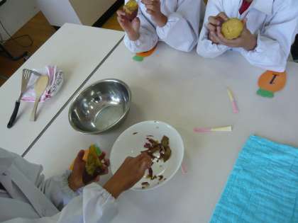10月に収穫したさつまいもをスイートポテトにして食べました。班のみんなでさつまいもの皮をはがし、つぶして砂糖とバターを入れて混ぜました。カップに入れてオーブンで焼き上がりを待っている間、みんなわくわくしていました。 作るだけでなく、食器洗いや配膳も班で協力して行いました。