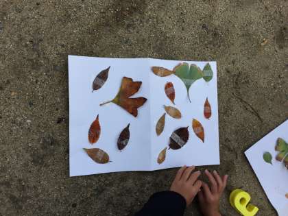 公園には落ち葉や木の実があり、子どもたちはそれぞれにお気に入りの秋を見つけて画用紙に貼りました。