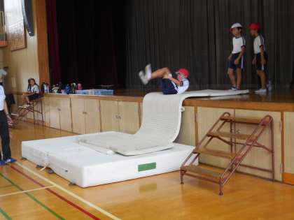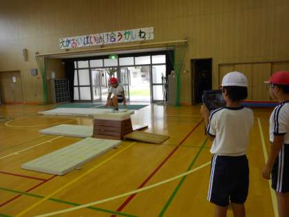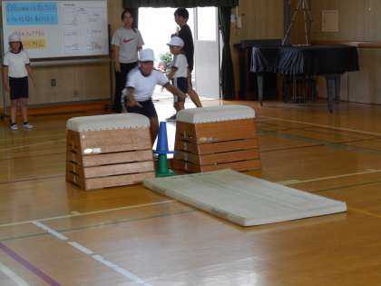 4年生は跳び箱運動を学習しています。4年生では、開脚とび、かかえこみとび、台上前転ができるように取り組んでいます。授業では、感覚作りの運動をしたあとに、自分のできない技にチャレンジして、タブレットや学習カードを活用して、互いに教えあいながら取り組んでいます。運動の楽しさや喜びに触れ、技の習得にがんばっています。