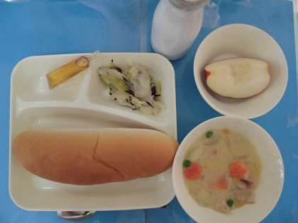 コーンクリームシチュー キャベツのひじきドレッシング りんご