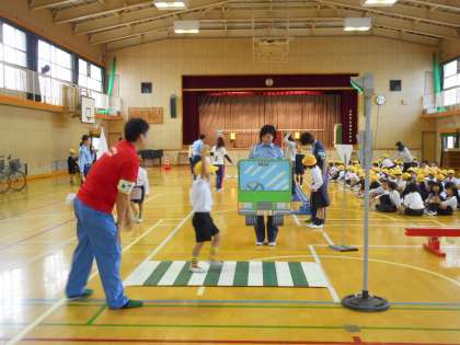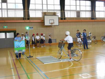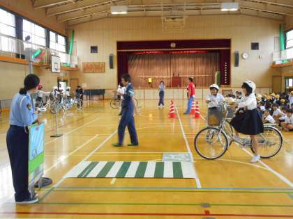 警察署の方に来ていただき、道路の歩行の仕方、横断歩道の渡り方、安全な自転車の乗り方などを教えてもらいました。雨のため体育館で実施しましたが、1年生から3年生は安全な道路歩行の仕方、4年生から6年生は自転車の安全な走行について学びました。今日、学んだことを日々の生活に生かしてほしいと思います。
