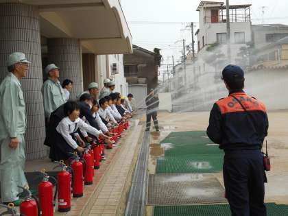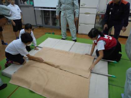 地域、消防署、区役所、あおぞら財団の協力を得て、防災教室を行いました。水消火器、担架づくり、応急手当(三角巾)を運動場でする予定でしたが、雨のため校内で行いました。消防士の方、地域の防災リーダーの方、女性部の方から教えていただき、消火器の使い方、毛布を使った簡易担架づくり、三角巾を使った応急手当の仕方を体験しました。