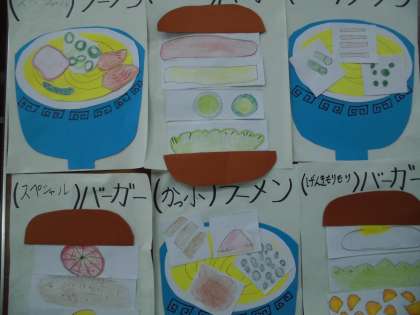土曜日、参観時に2年生は学活で食に関する指導「元気もりもりコックさんになろう!」を行いました。「元気になるために赤・黄・みどりのそろったものをたべよう」をめあてに班に分かれバランスのよいバーガー・ラーメンを考えました。麺・パンにたらない赤色・緑色の食べ物を自分たちで考え、画用紙に絵を書き、名前も考え、班で発表しました。とてもバランスのよい、美味しそうなバーガー・ラーメンが出来上がりました。そして発表は、どの班もとても大きな声でじょうずにしてくれました。聞いている児童・保護者のみなさんはとてもよくわかりました。