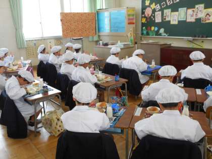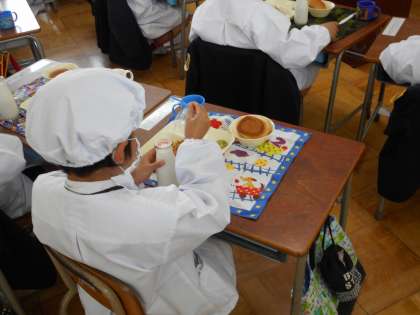 本日から給食が始まりました。1年生にとって初めての小学校での給食です。栄養教諭から給食の用意の仕方や牛乳瓶のふたの開け方、給食の食べ方などを教えてもらいました。今日の給食は焼きそばでした。1年生は初めての小学校給食とは思えないほど、上手に食べていました。とても美味しいと、大満足の給食でした。