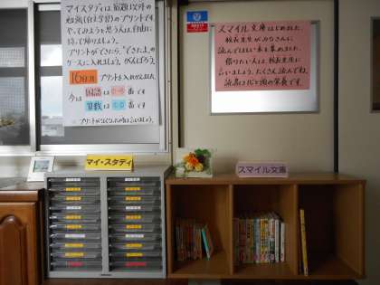 校長室前に宿題以外の勉強(自主学習)のために、プリントをレターケースに入れています。国語と算数のプリントが入っています。自由に持ち帰って、提出すると添削してもらえます。今年もがんばってほしいと思います。また、校長先生が読んでほしい図書25冊がスマイル文庫という名前で、置いています。借りたい人は校長先生に言うと、借りることができます。読書の楽しさにふれる機会にしてほしいです。