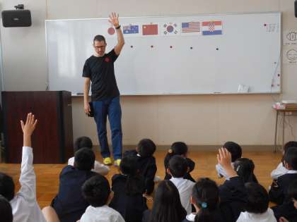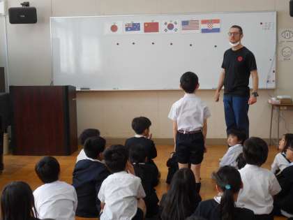 毎週火曜日に、C−NETの先生が来ます。ネイティブスピーカーで、子どもたちに英語を教えています。担任とコラボして、子どもたちに英語の楽しさを教えています。また、給食時には、本日のメニューを英語で紹介してもらっています。