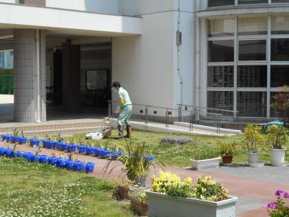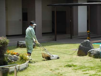 校舎の周りの清掃、登校時の見守り、園芸、修繕・修理など、学校の教育環境を整えるために、仕事をしている管理作業員さん。今日は、芝生の手入れをしてくれました。いつもありがとうございます。