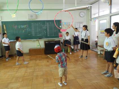 土曜授業・学校公開として、柏小まつりを行いました。1年生から6年生の異学年集団である「たてわり班」でお店をつくりました。たてわり班2班でお店をつくり、お店番とお店をまわる班に分かれて活動しました。お店は、輪なげ大会、うでじまん、やりなげ、缶アタック、的入れ、びっくり・どっきり箱、1円玉おとし、わくわく宝探し、くじ引き、記憶力ゲーム、ボーリング、魚釣りで、全部で12あります。どのお店も楽しく遊べる工夫をしていました。