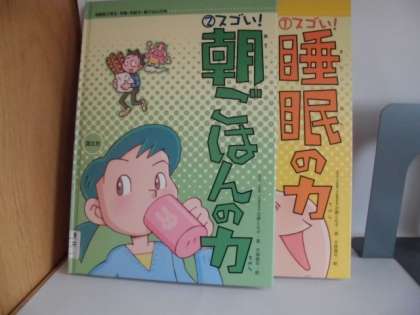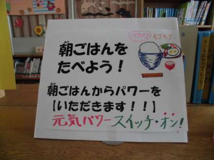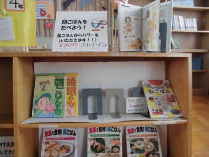 図書館補助員の浅川先生により、朝ごはんに関した本を集めて、朝ごはんコーナーを設けていただきました。朝ごはんの大切さ、朝ごはんの働きなどとっても楽しい本がならんでいます。