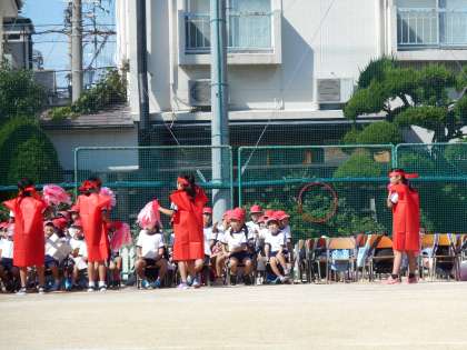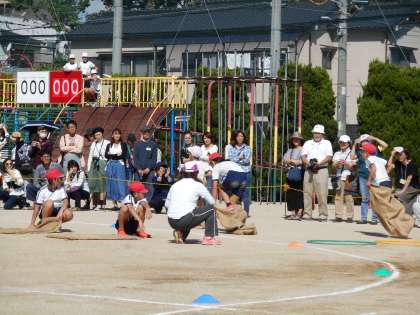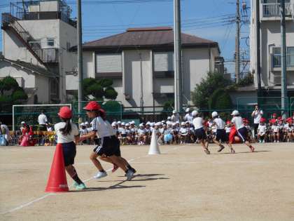 秋晴れのもと、運動会がありました。5年生の障害物競走と3年生の台風の目です。応援係が一生懸命に応援しています。