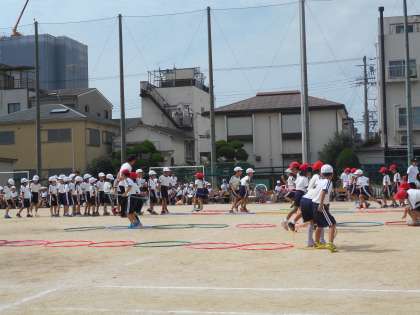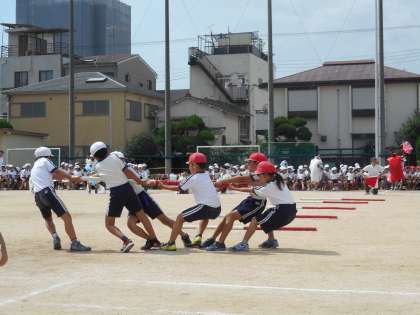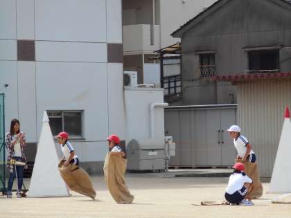 3年生の障害物競走です。麻袋に入って跳ぶのが難しかったですが、最後まで頑張りました。1・2年生はフラフープを並べて、1年生と2年生が手をつないでぴょんぴょんと跳びました。4年生は棒引きです。最後まであきらめずに棒を引っ張り合い、白熱していました。