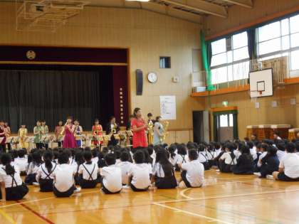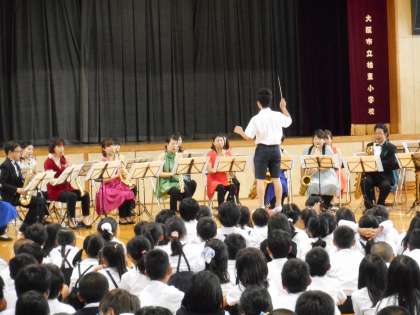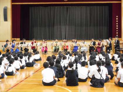サクスフォンアンサンブルの楽団を講堂に招いて、音楽鑑賞会を行いました。6種類のサクソフォンだけによるアンサンブルで、クラシック音楽や唱歌メドレー、ジブリメドレーなど楽しい音楽を演奏してもらいました。その他に楽器紹介、楽器クイズ、指揮者体験がありました。最後は、全員で「ビリーブ」を歌いました。本物の音楽に触れ、心が安らぎました。