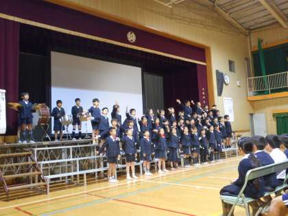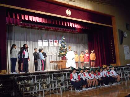 1年生は動物に扮して、4種類のことば遊びゲームをしました。その様子を実況生中継する劇でした。とてもかわいかったです。3年生は歌ったり踊ったり合奏したりして、音楽隊になりきって楽しい音楽ショーを披露しました。5年生は、ちょっぴり不思議で心温まる劇でした。サンタクロースや天使、神様が登場して楽しい劇でした。